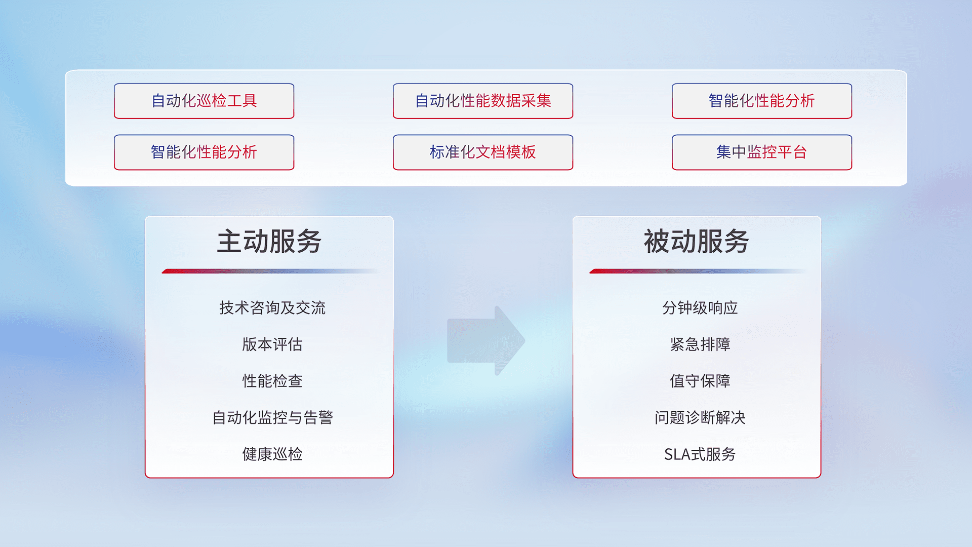 智能化工具和标准化文档,,保障服务质量,,,,提供主动服务(包含技术咨询、、、、版本评估、、、、性能检查、、自动化监控与告警、、、健康巡检)和被动服务包含(分钟级响应、、紧急排障、、值守保障、、、、问题诊断解决、、、、SLA服务)。。。。