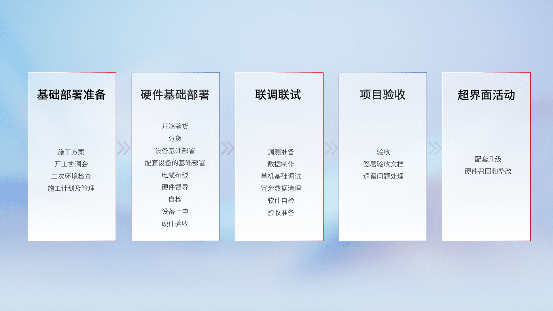 从基础部署准备、、硬件基础部署、、、、联调联试、、、、项目验收、、、、越界面活动的全过程可追溯,,,,保证施工质量和进度。。。。